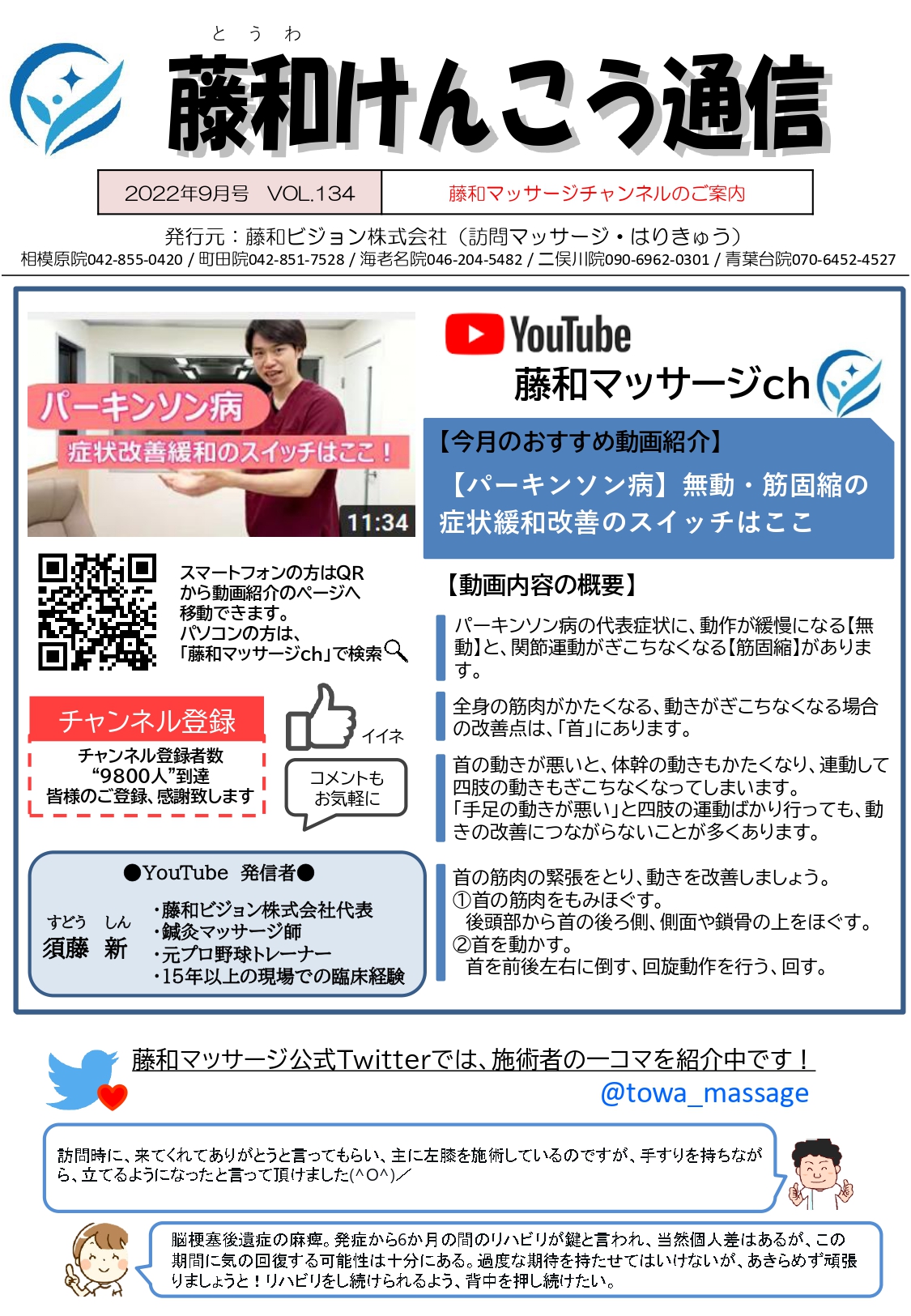 藤和マッサージが毎月発行しているニュースレターです。訪問マッサージ・はりきゅうに関わることや、難病や障害のこと、そして医療介護のニュースなどをお伝えしております。
